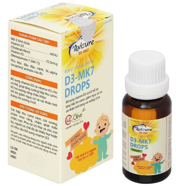 Siro Avisure D3-MK7 hỗ trợ hấp thu canxi 20 ml phù hợp sử dụng cho trẻ hấp thu canxi kém, có các biểu hiện như còi xương, chậm mọc răng, chậm phát triển chiều cao.