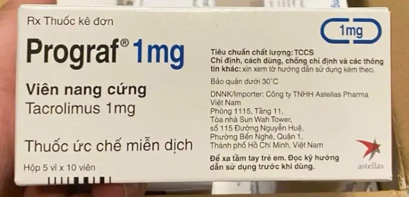 Prograf 1mg là thuốc chứa Tacrolimus, thuộc nhóm thuốc ức chế miễn dịch, được dùng để phòng ngừa và điều trị tình trạng thải ghép nội tạng (như thận, gan, tim) sau phẫu thuật cấy ghép. Thuốc giúp ngăn hệ miễn dịch tấn công cơ quan được ghép, thường dùng phối hợp với các thuốc khác như corticosteroid.