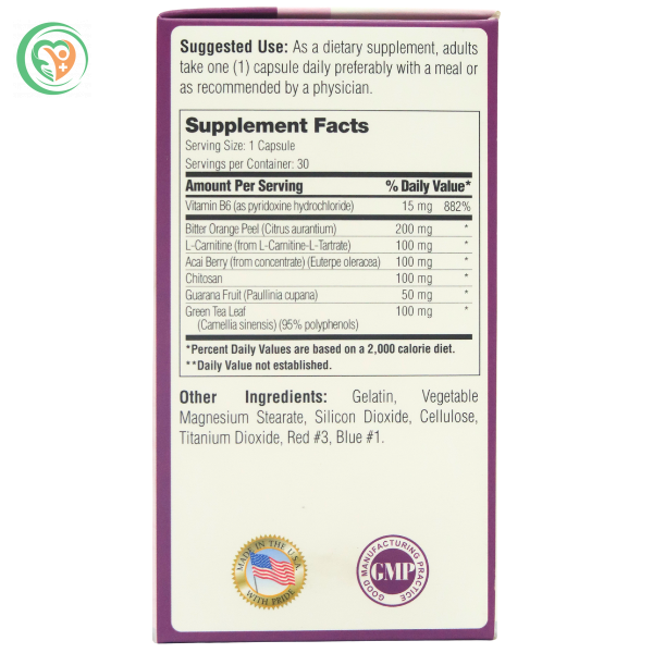 Vitamin B6 (Pyridoxine HCl 82%), Bitter Orange Peel, L-Carnitine, Acai Beery (Fruit), chitosan, Guarana (fruit), Green tea 95% Polyphenols.