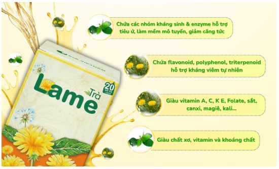 Các nghiên cứu cho thấy bồ công anh chứa đa dạng các nhóm vitamin A, C, K E, Folate cùng nhiều khoáng chất (sắt, canxi, magiê, kali…). Lá sung giúp lợi sữa nhờ chứa nhiều vitamin, chất xơ và các chất dinh dưỡng có lợi cho tiêu hóa. Sự kết hợp giữa bồ công anh và lá sung trong Trà lợi sữa Lame giúp bổ sung nhanh các khoáng chất cho cơ thể nhận tín hiệu sản sinh hormone prolactin, từ đó thúc đẩy nhanh quá trình tiết sữa. Đồng thời các nhóm vitamin, khoáng chất này còn hỗ trợ tăng cường dinh dưỡng cho sữa mẹ một cách tự nhiên và an toàn.