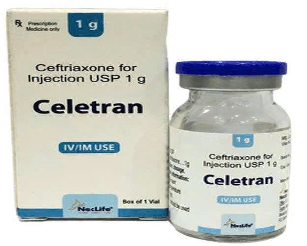 Celetran là thuốc tiêm chứa Ceftriaxone 1 g, thuộc nhóm kháng sinh cephalosporin thế hệ 3, dùng để điều trị các nhiễm khuẩn nặng do vi khuẩn nhạy cảm. Sản phẩm được sản xuất bởi Neclife, dùng theo đường tiêm tĩnh mạch (IV) hoặc tiêm bắp (IM).
