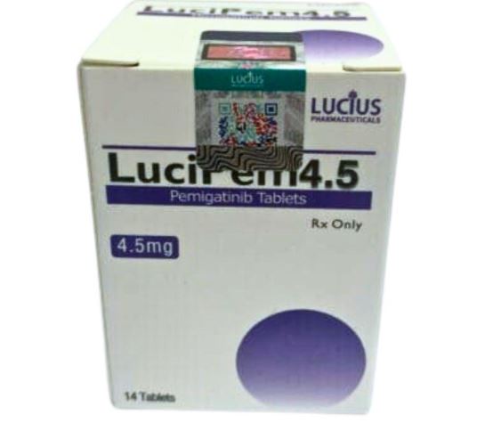 Thuốc Lucipem 4.5 với hoạt chất chính là Pemigatinib, được sử dụng để điều trị cho bệnh nhân bị ung thư đường mật đã di căn hoặc tình trạng bệnh có sự tiến triển. Ngoài ra, thuốc cũng được dùng chỉ định điều trị cho bệnh nhân có xuất hiện khối u tủy, u hạch bạch huyết đã từng điều trị bằng liệu pháp khác nhưng vẫn tái phát.