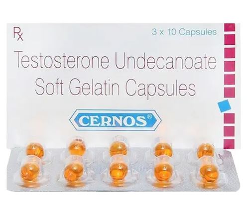 Viên nang mềm Cernos chứa hoạt chất Testosterone Undecanoate 40mg. Thuốc này là một liệu pháp thay thế testosterone (HRT), được sử dụng để điều trị tình trạng thiểu năng sinh dục nam giới (cơ thể không sản xuất đủ testosterone tự nhiên).